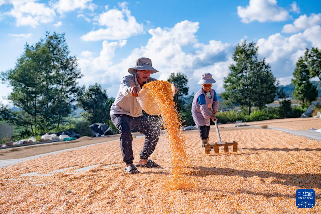 10月11日,云南省文山壮族苗族自治州广南县莲城镇那朵村的农民在晾晒收获的玉米。新华社发(熊平祥摄)