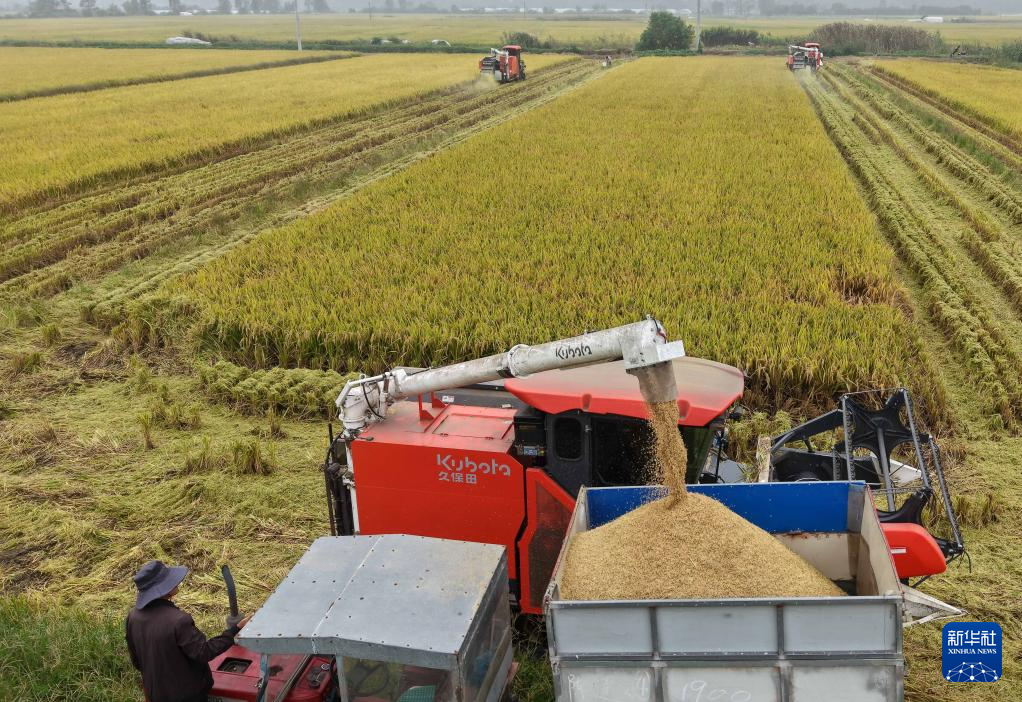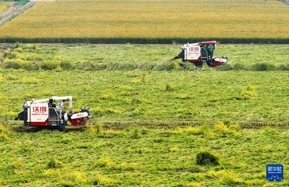 10月11日,在江苏省扬州市邗江区公道镇,农民驾驶农机收割水稻(无人机照片)。新华社发(孟德龙摄)
