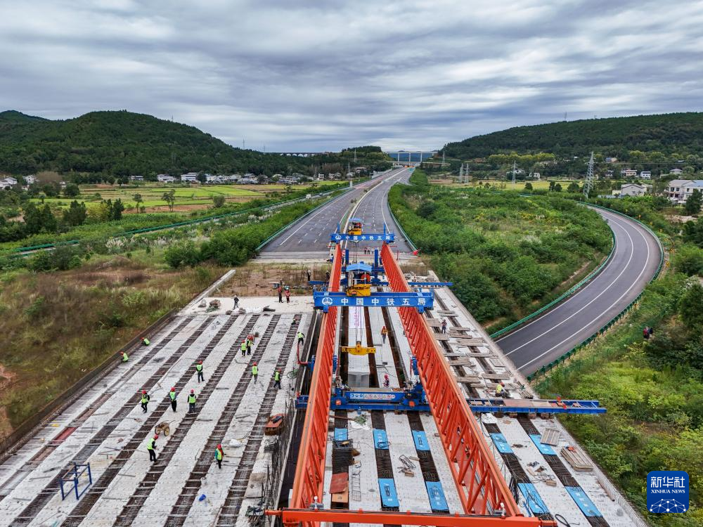 这是10月12日拍摄的京昆高速广元至绵阳段扩容工程牛头河大桥架梁作业现场(无人机照片)。新华社记者 王曦 摄