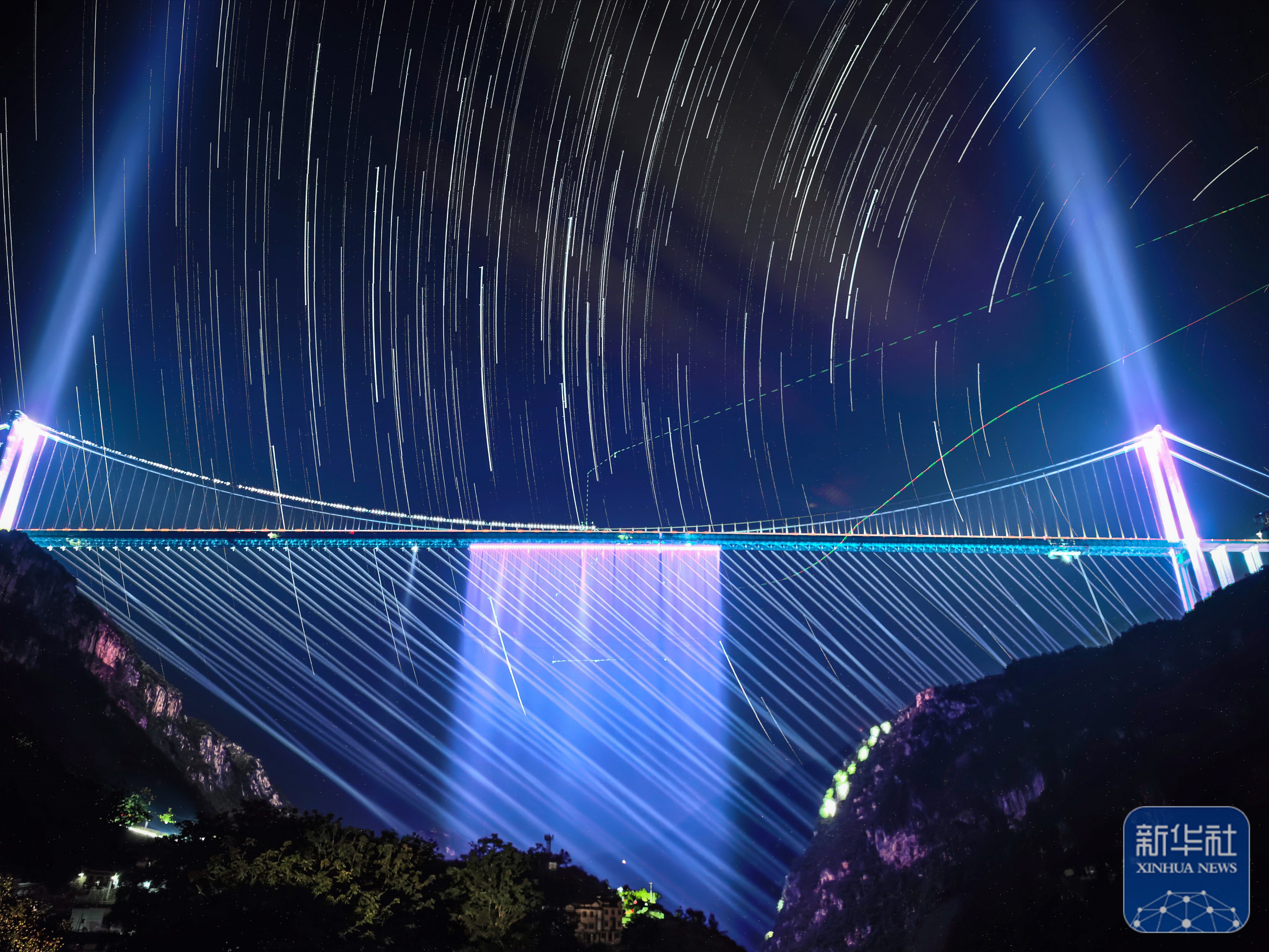 夜晚,新的世界第一高桥——贵州花江峡谷大桥呈现出不同光影美景,吸引游客前来观赏。