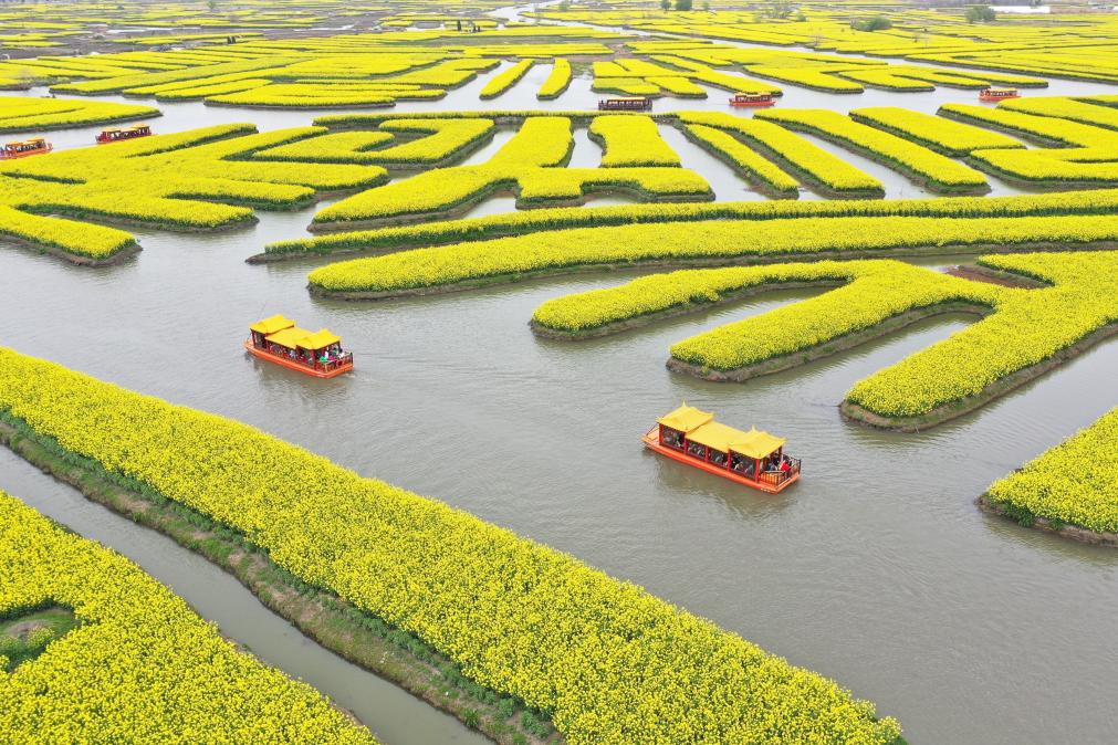 2023年3月29日,游客乘坐画舫欣赏千垛菜花风景区两岸油菜花(无人机照片)。新华社记者 毛俊 摄