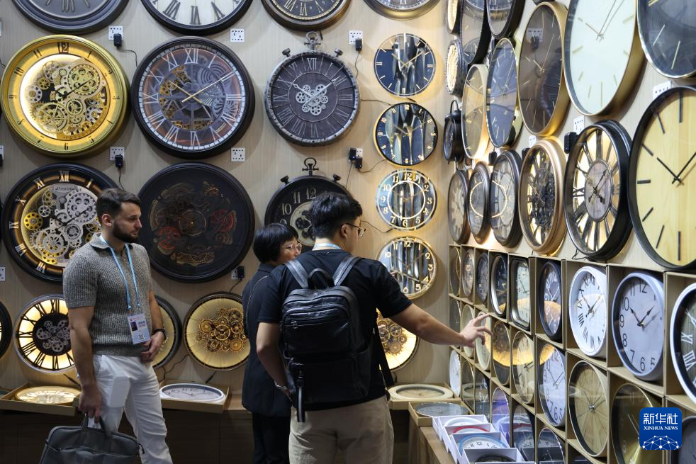 10月23日,客商在广交会上参观选购钟表。新华社记者 卢汉欣 摄