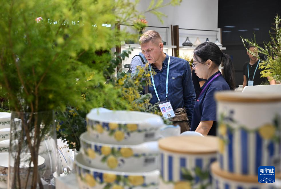 10月23日,境外采购商在日用瓷器企业展台洽谈。新华社记者 邓华 摄