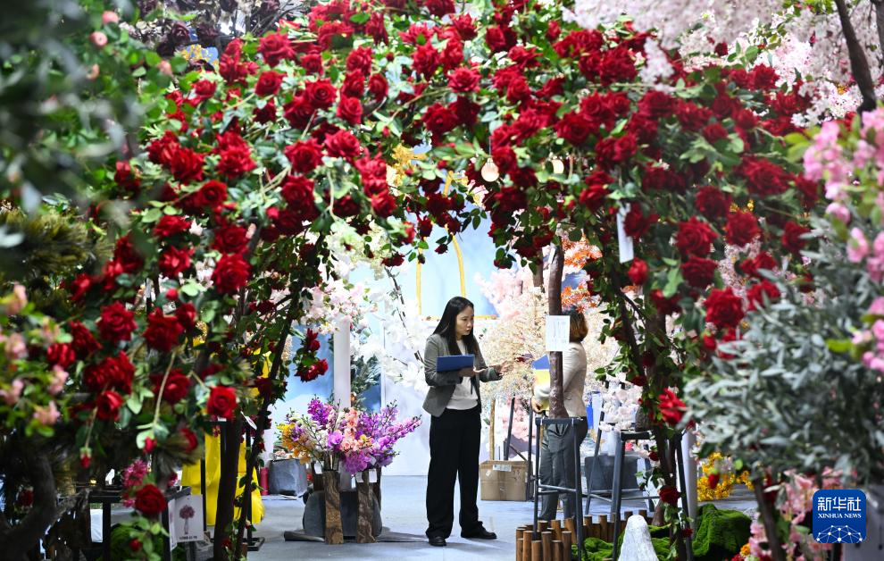 10月23日,工作人员在仿真花展台洽谈。新华社记者 邓华 摄