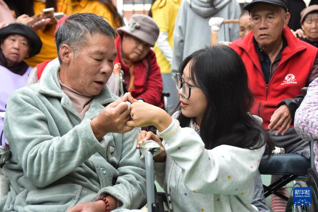 10月25日,在云南省蒙自市爱心养老院,志愿者和老人一起做手指操。新华社发(薛莹莹摄)