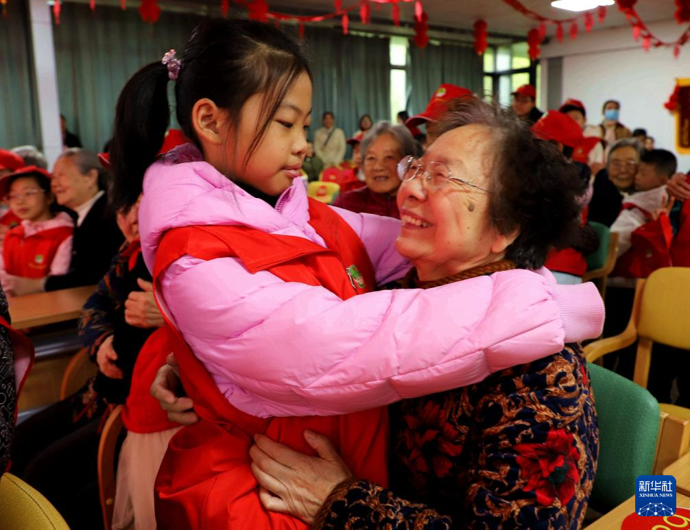 10月25日,在河南省南阳市中健天佑独山基地养老院,南阳市小雷锋志愿者协会的志愿者与老人进行“抱一抱 更温暖”互动活动。新华社发(高嵩摄)