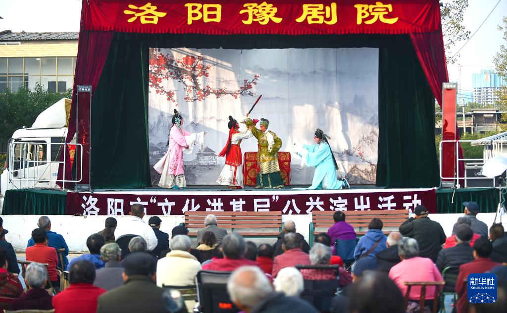 10月26日,在河南省洛阳市涧西区工农街道大所社区文化广场举行的重阳节公益演出活动上,洛阳豫剧院的演员们为老人表演豫剧节目。新华社发(黄政伟摄)