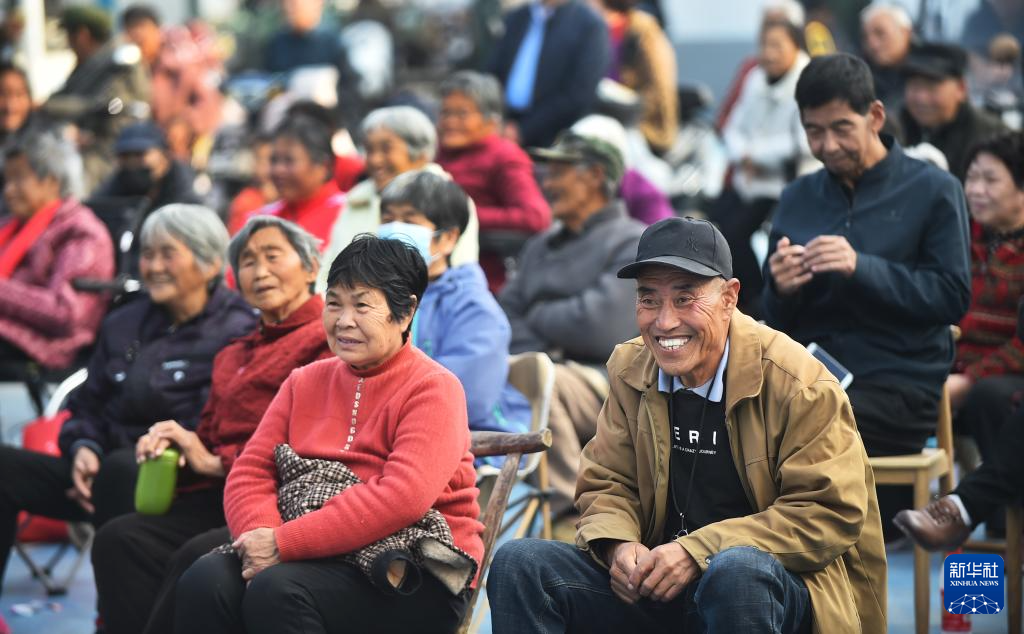 10月26日,老人们在河南省洛阳市涧西区工农街道大所社区文化广场举行的重阳节公益演出活动上欣赏豫剧节目。新华社发(黄政伟摄)