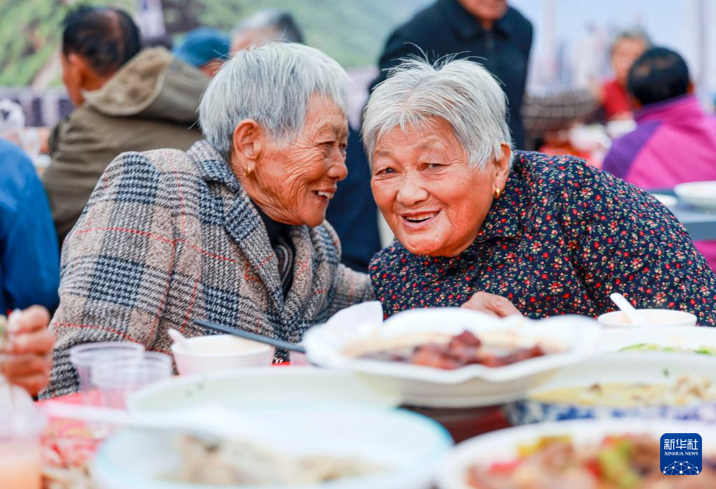 10月26日,江苏省泰州市姜堰区白米镇马沟村第三届重阳节“百寿宴”现场,两名老人在席间交流。新华社发(顾继红摄)
