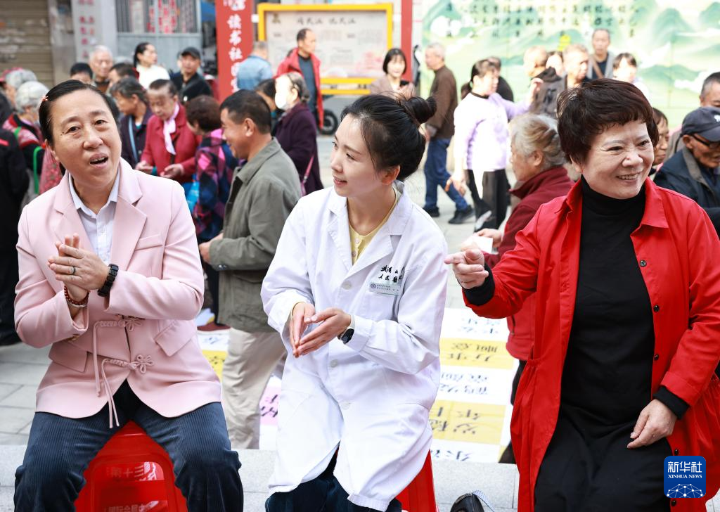 10月28日,湖北省人民医院医务人员为武汉市武昌区黄鹤楼街道读书社区老年人提供音乐疗法服务。新华社发(赵军摄)