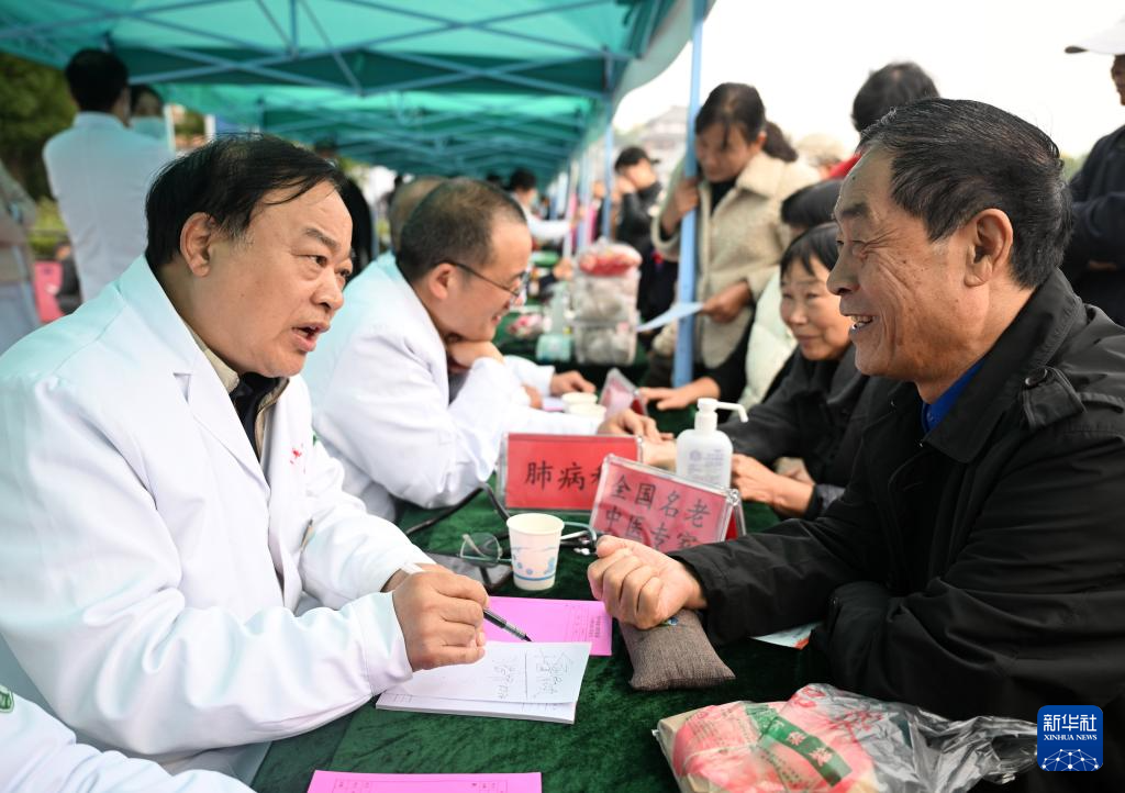 10月29日,在2025年全国“我们的节日·重阳”主题文化活动河南西平主题示范活动上,西平县中医院的医生为老年人义诊。 新华社记者 李嘉南 摄