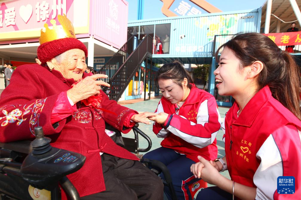 10月29日,江苏徐州高等师范学校的大学生志愿者与铜山区三堡街道潘楼村的老人聊天,为老人修剪指甲。新华社发(蒯创摄)