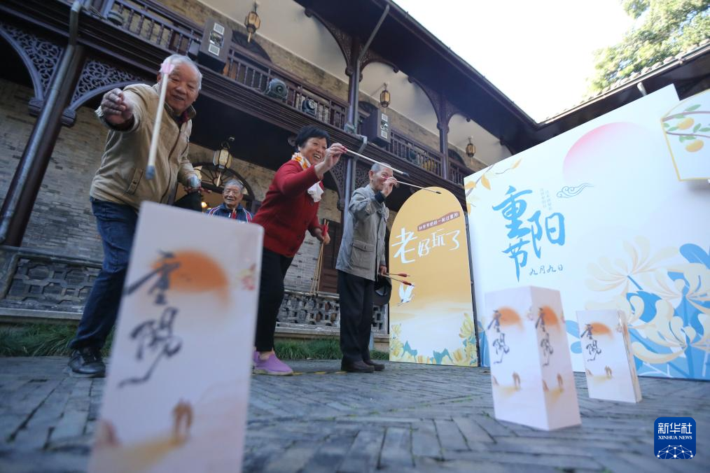 10月29日,在江苏省扬州市何园景区,老年游客们在体验投壶游戏。 新华社发(孟德龙摄)