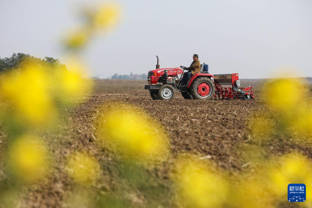 11月3日,河南省平顶山市宝丰县大营镇赵楼村农民驾驶农机播种冬小麦。新华社发(何五昌 摄)