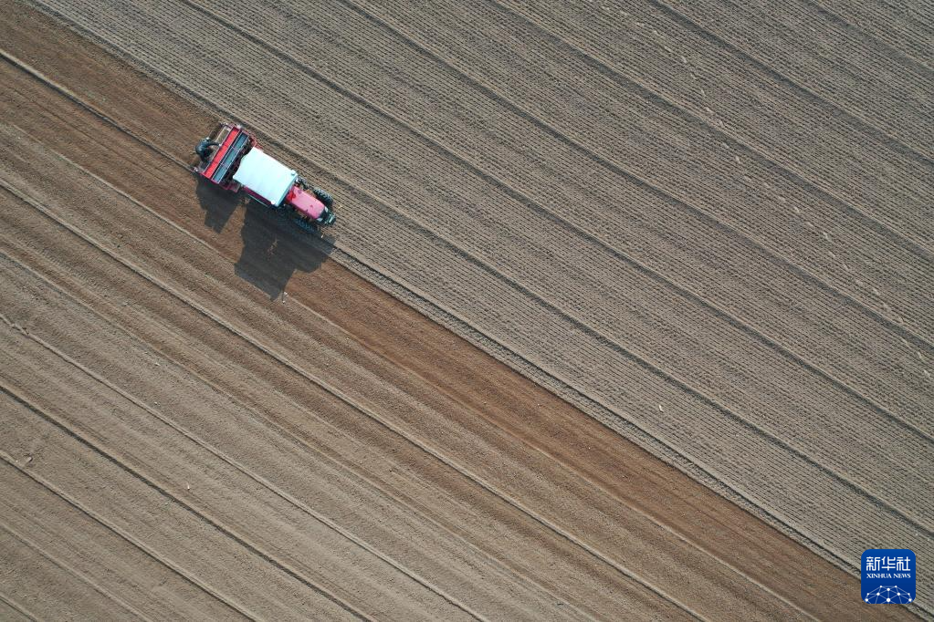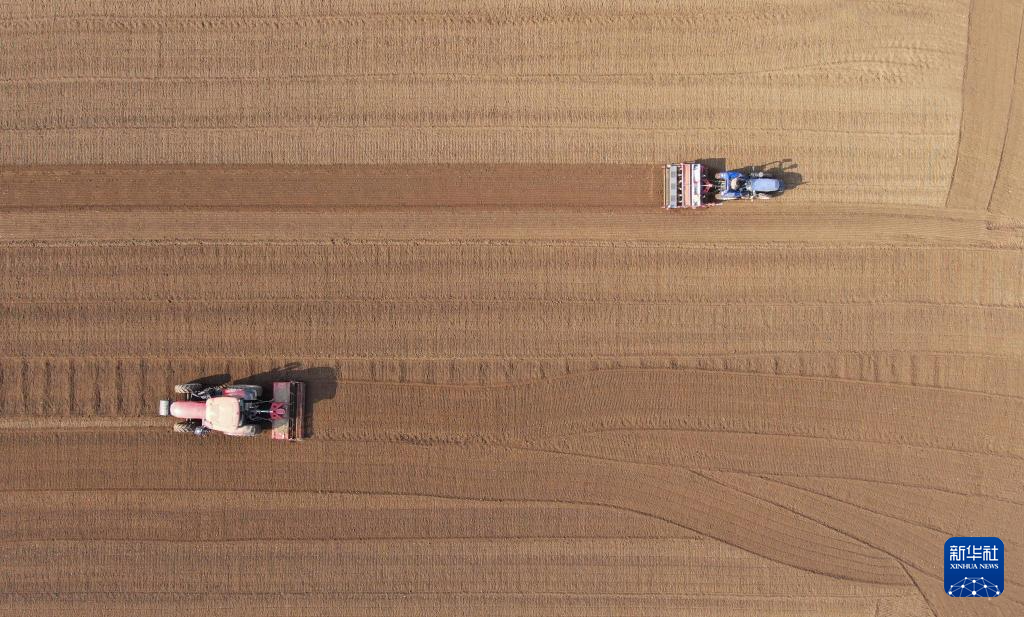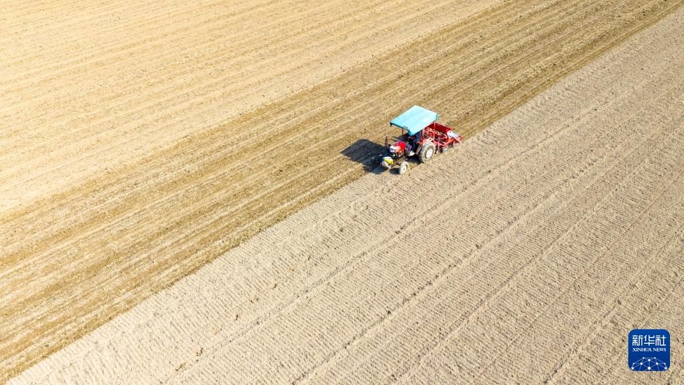 11月3日,在河北省石家庄新乐市化皮镇官庄村,农民驾驶农机播种小麦(无人机照片)。新华社发(贾敏杰 摄)