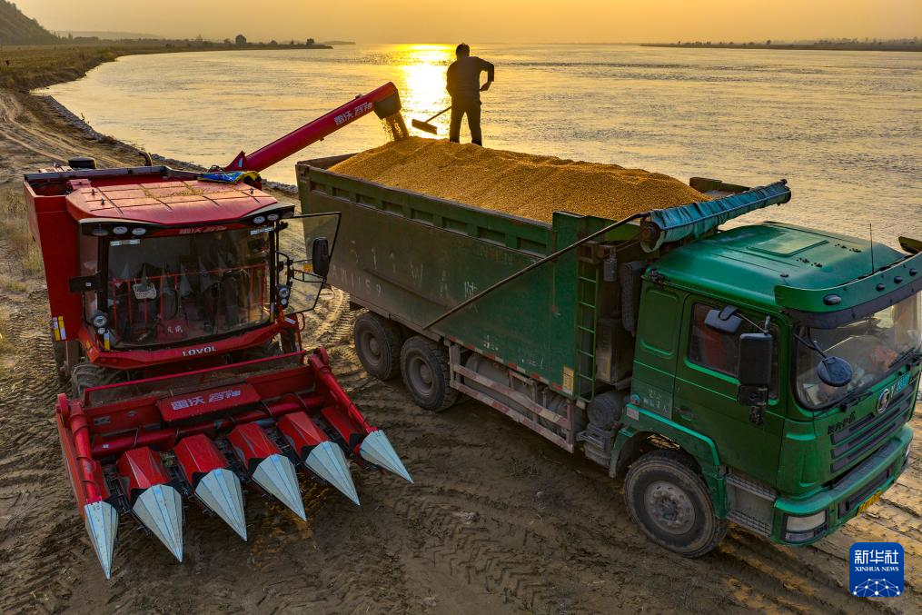 11月2日,在河南省三门峡市灵宝西阎乡黄河岸边,收割机把抢收的玉米装车(无人机照片)。 新华社发(杜杰摄)