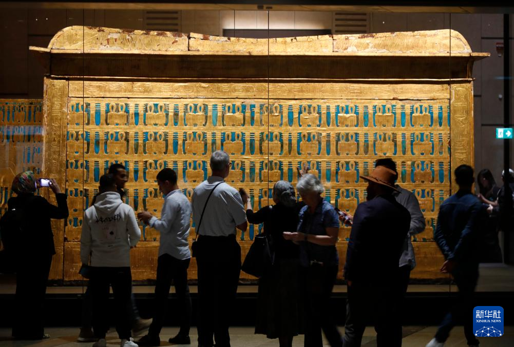 11月4日,在埃及吉萨的大埃及博物馆,游客在法老图坦卡蒙展馆参观神龛。新华社发(艾哈迈德·戈马摄)