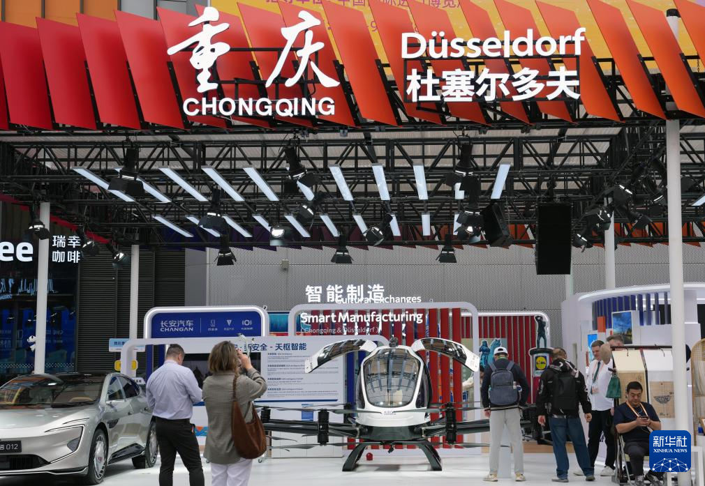 这是中国重庆与德国杜塞尔多夫在第八届进博会上共同举办的双城联展现场,展出内容涵盖文化、经贸等领域合作成果(11月8日摄)。新华社记者 刘颖 摄