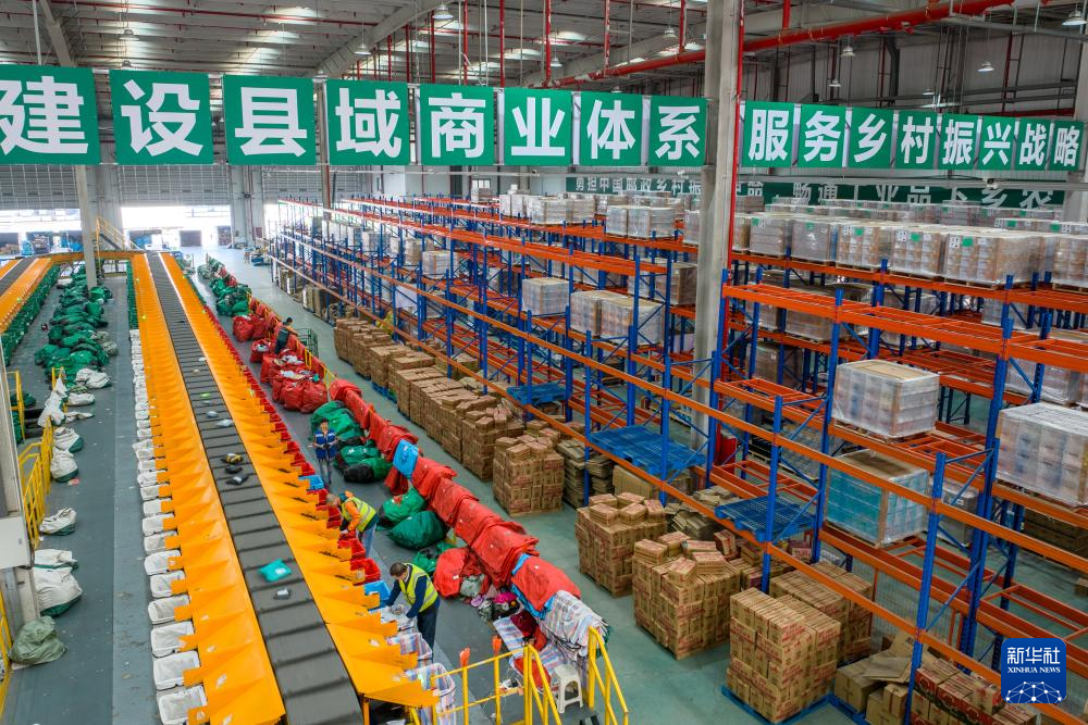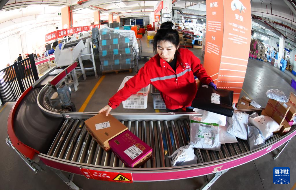 11月9日,在中国邮政集团有限公司河南省商丘市夏邑县分公司邮件处理中心,投递员在分拣包裹。新华社发(苗育才摄)