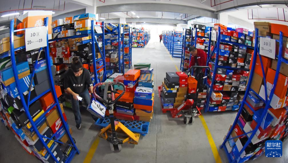 11月10日,在江苏省连云港市连云区一家电商物流仓库,工作人员在转运货物。新华社发(王春摄)