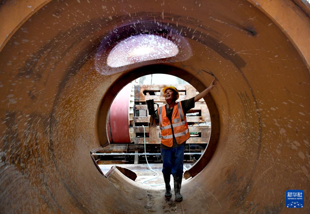 12月5日,工人在三亚河口通道工程项目现场检查贯通管相邻管节状态。新华社记者赵颖全摄