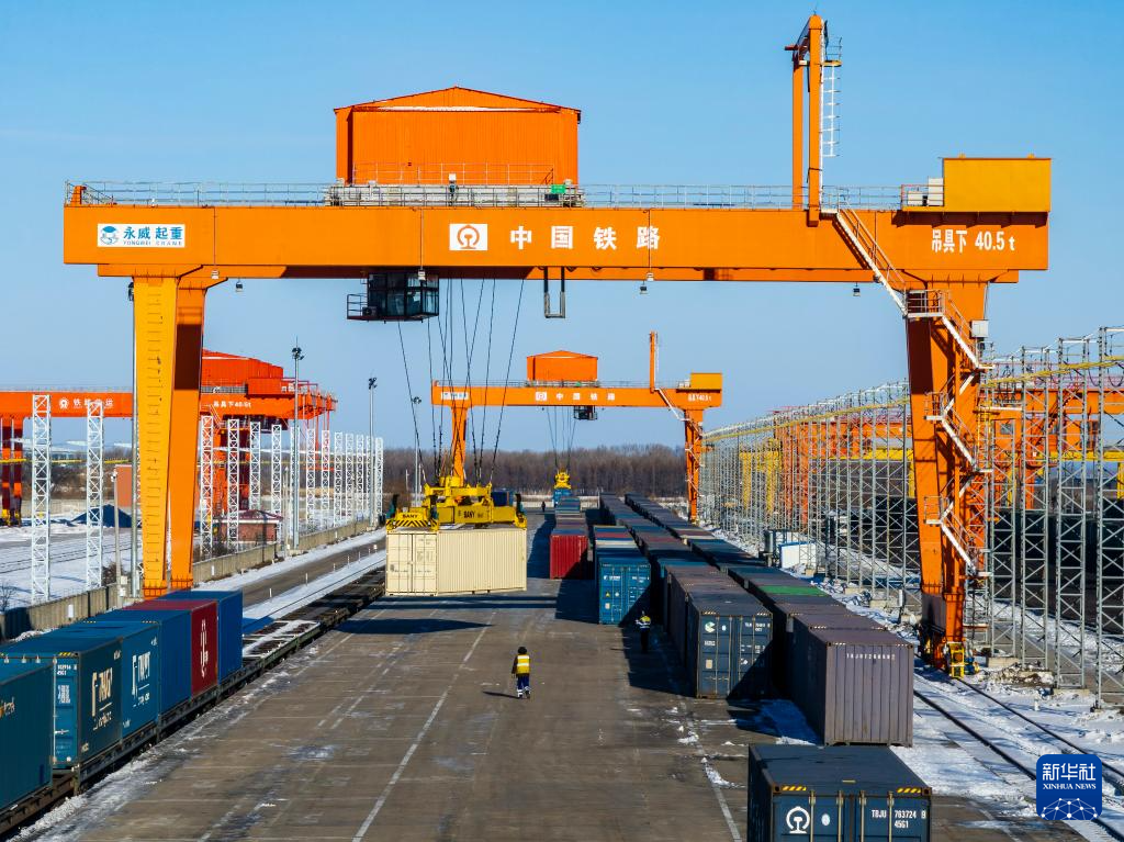 12月10日,中国铁路哈尔滨局集团有限公司绥芬河站三货区正面吊在进行倒箱作业(无人机照片)。新华社发(曲艺伟摄)