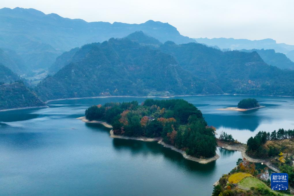 12月10日拍摄的浙江省台州市仙居县横溪镇郑桥水库一景(无人机照片)。新华社发(王华斌摄)