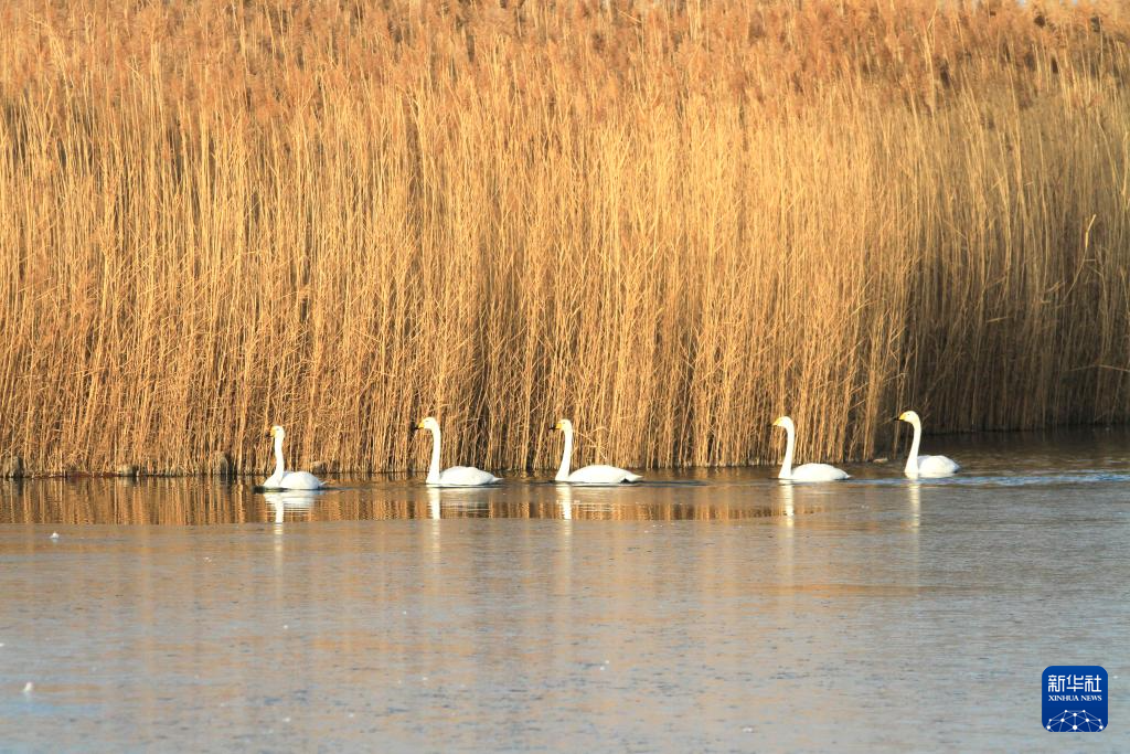 12月10日,几只大白天鹅在甘肃张掖国家湿地公园的水面上悠闲游弋。新华社发(陈礼摄)
