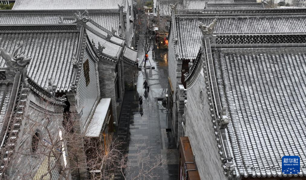 12月12日拍摄的雪中的郑州市“亳都·新象”街区。新华社发(马健摄)