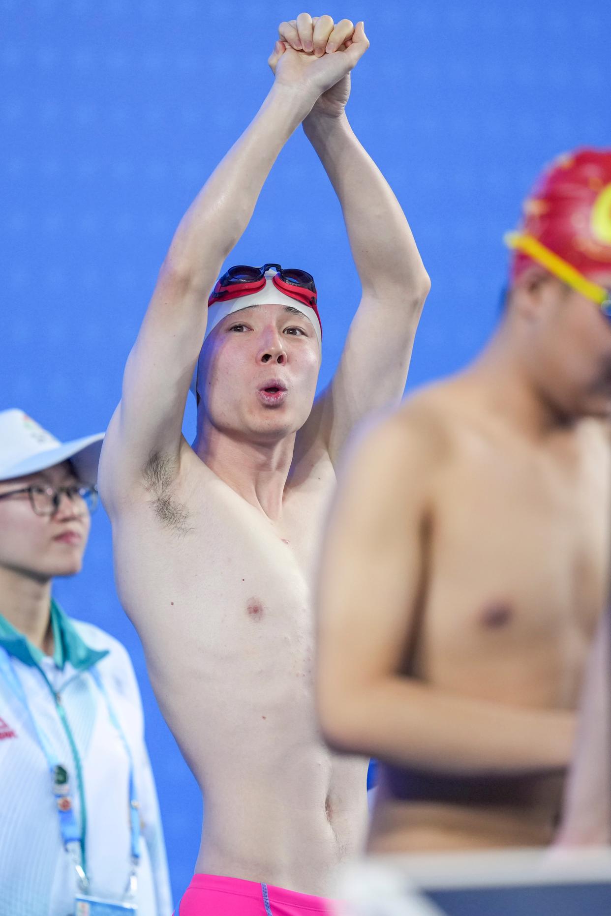 12月14日,孙宇亮在男子22-29岁组4X50米自由泳接力第1组决赛后庆祝夺冠。新华社记者 伍志尊 摄