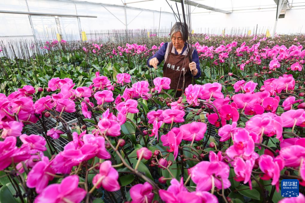 12月17日,工作人员在河北省石家庄市藁城区廉州镇一家花卉种植基地养护蝴蝶兰花卉。新华社发(梁子栋摄)