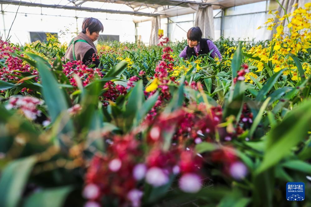 12月17日,工作人员在河北省迁西县罗家屯镇一家花卉种植基地的花卉种植车间工作。新华社发(刘满仓摄)