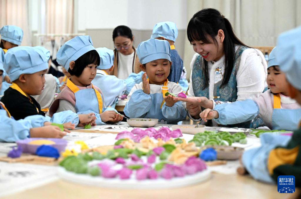12月19日,在河北省石家庄新乐市市直第二幼儿园,老师教小朋友包饺子。新华社发(贾敏杰摄)