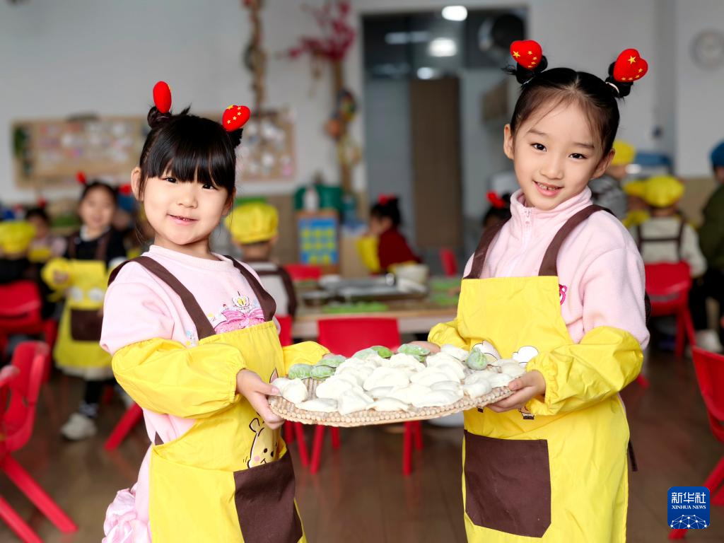 12月19日,在河北省石家庄市栾城区第二幼儿园,小朋友展示他们包的饺子。新华社发(李明发摄)