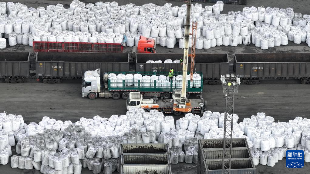 12月22日,在内蒙古二连浩特市,一列中欧班列在装货(无人机照片)。新华社记者 马金瑞 摄