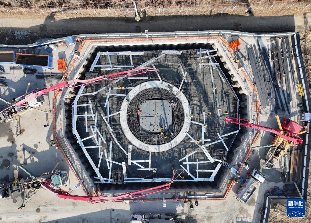 中铁十一局工人在石雄铁路跨朔黄铁路特大桥176号墩转体桥承台浇筑现场作业(12月23日摄,无人机照片)。新华社记者 牟宇 摄