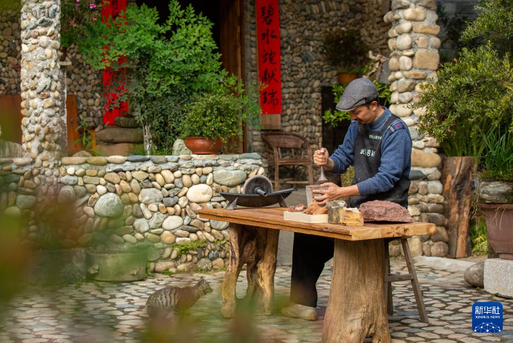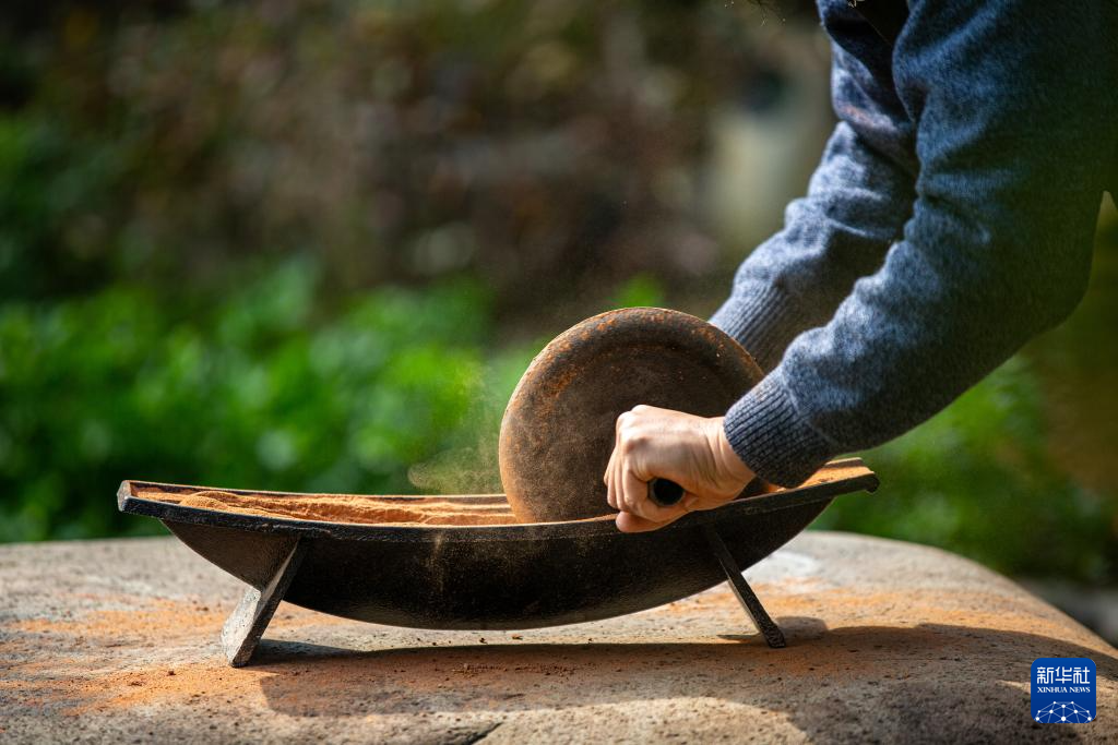12月19日,武夷岩彩画师胡磊将采集回的岩土碾碎研磨成粉。新华社发(陈颖 摄)