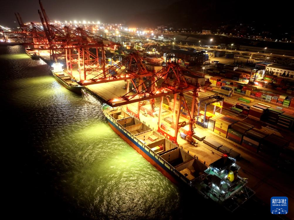 12月31日凌晨,在江苏省连云港港集装箱码头,货轮在泊位装卸集装箱(无人机照片)。新华社发(王春摄)