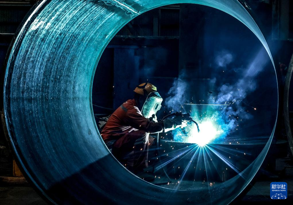 12月31日,在位于武汉的中铁科工集团轨道交通装备有限公司技术工人对门吊配件进行焊接作业。新华社发(赵军摄)