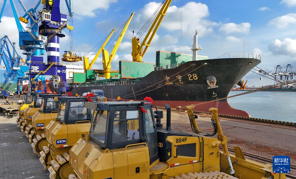12月31日,在山东港口烟台港,烟台港至东南亚件杂货班轮在装运要出口印度尼西亚的国产工程机械(无人机照片)。新华社发(唐克摄)