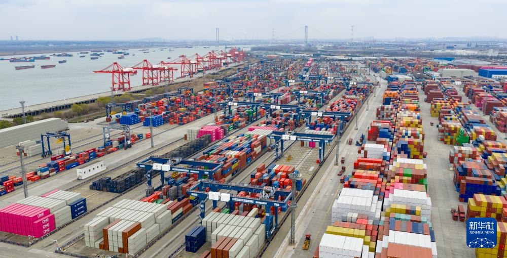 12月31日拍摄的江苏省港口集团南京港龙潭集装箱码头上的生产场景(无人机照片)。新华社发(杨素平摄)