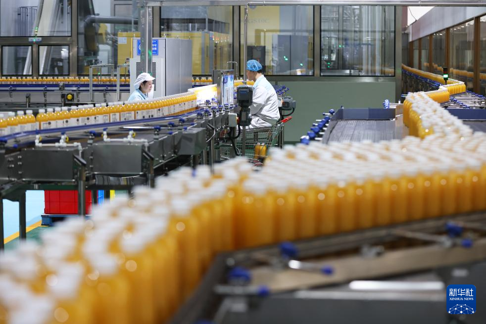 12月31日,工人在浙江省湖州市德清县乾元镇的一个生产车间内检查果汁产品质量。新华社发(倪立芳摄)