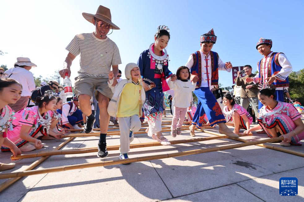 1月1日,游客在海南省三亚南山文化旅游区跳竹竿舞。新华社发(陈文武 摄)