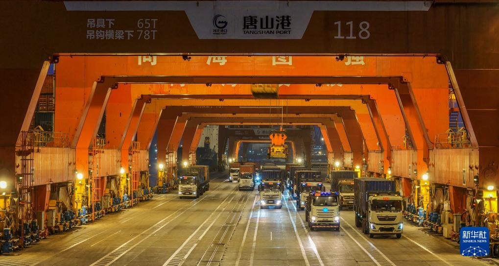 1月2日清晨,在河北省唐山港京唐港区集装箱码头,车辆在运输集装箱(无人机照片)。新华社发(刘满仓 摄)