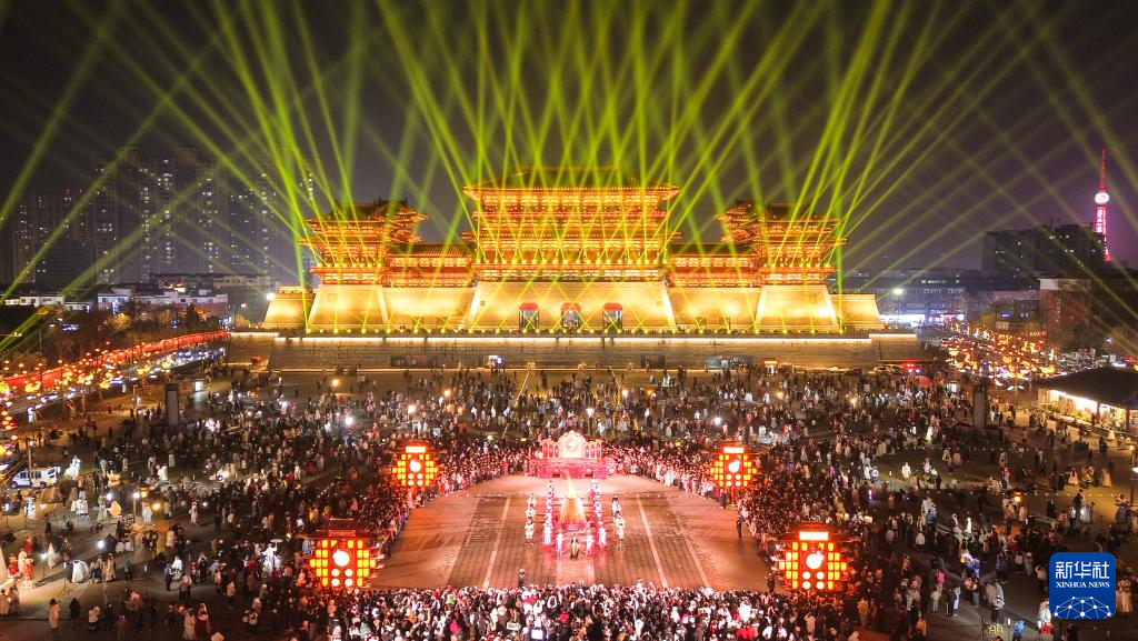 1月1日,游客在河南省洛阳市隋唐洛阳城国家遗址公园内欣赏演出。新华社发(黄政伟摄)
