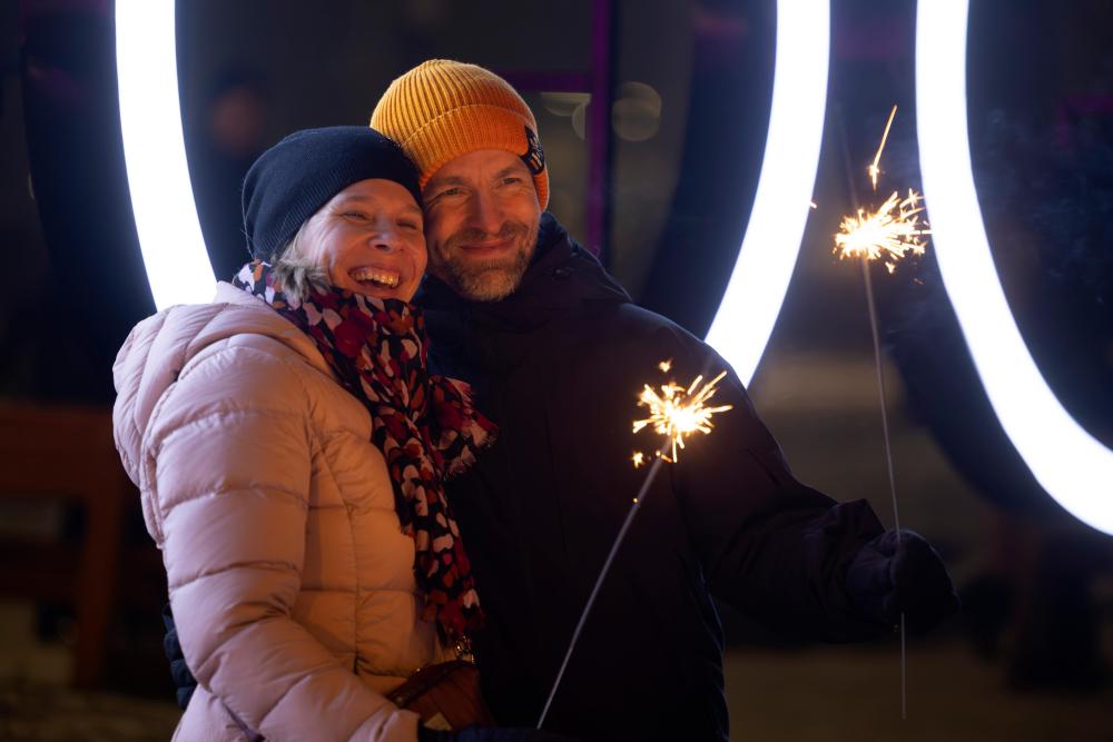 2025年12月31日,在芬兰南部城市埃斯波举行的“北极光”主题迎新年灯光秀活动现场,人们燃放烟花迎接新年。
