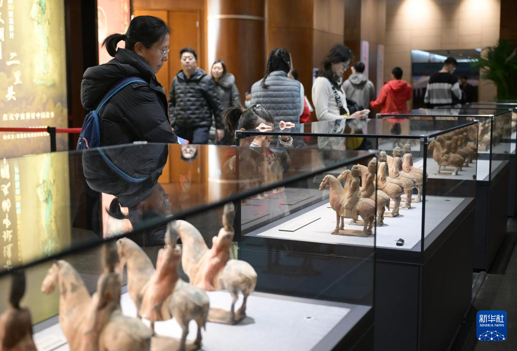 1月3日,观众在中国考古博物馆参观北朝湾漳壁画墓陶骑马俑展区。新华社记者 李贺 摄