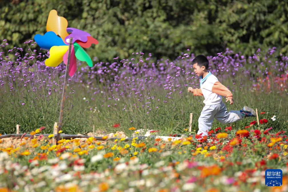 1月11日,小朋友在云南省景洪市工业园区管委会曼沙村的花海里奔跑玩耍。新华社发(李云生摄)