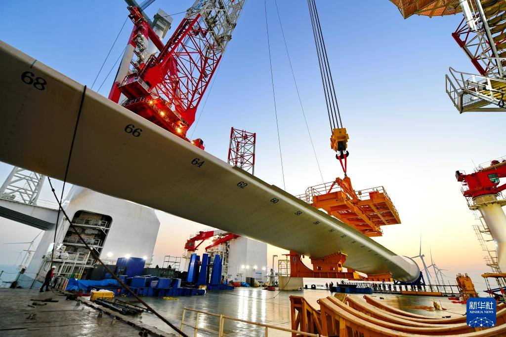 1月13日,在“大桥海风”号2000吨自升式海上风电安装平台上,20兆瓦风机叶片在进行吊装(无人机照片)。
