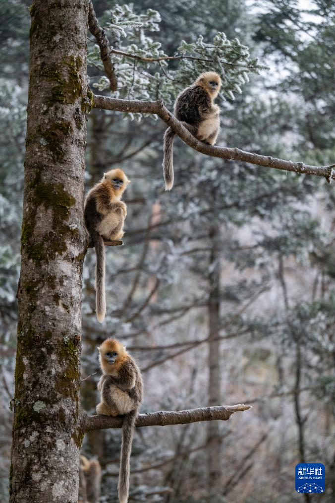 1月19日,金丝猴在神农架国家公园大龙潭金丝猴野外研究基地山林中活动。新华社记者 伍志尊 摄